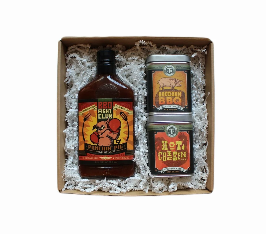This gift set is packed with southern flavor. The "People Tested, Pig Approved" BBQ sauce is a secret recipe from Nashville's Hog Haven and was chosen by Southern Living Magazine as "the South's Best Barbecue Sauce". Paired with two grill seasoning blends from J.M. Thomason, this set makes for the perfect gift for the grill master in your life.