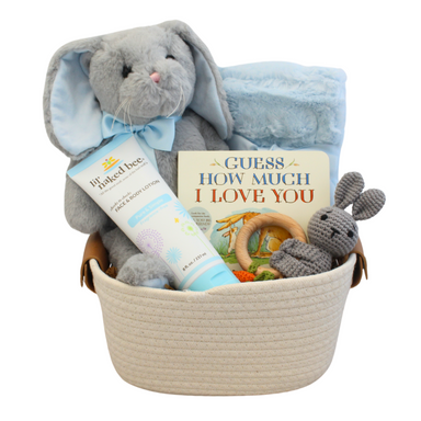 View full detailsWelcome a sweet little boy with this adorable bunny basket. Local delivery and pick up orders will be packaged in an ivory twill basket and orders...